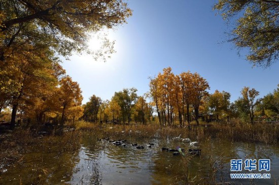 这是金塔县城以西巴丹吉林沙漠边缘的胡杨林(10月13日摄)。范培珅 摄