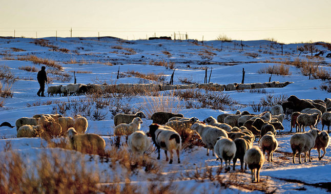 一名牧民赶着羊群走过正镶白旗乌兰察布苏木被积雪覆盖的草原。