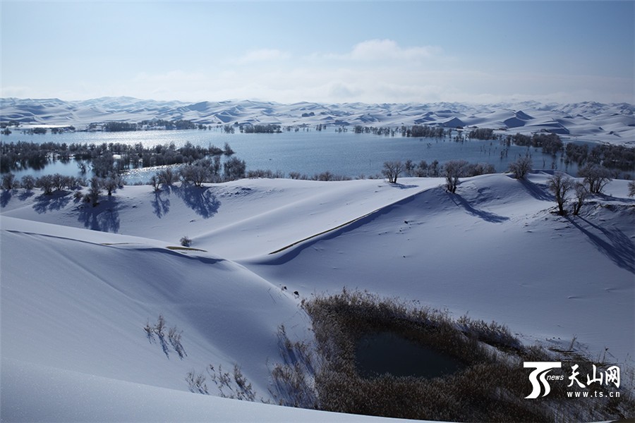 12月19日,新疆塔里木河下游段33团葫芦岛银装素裹,雪中的沙漠和胡杨洁白无瑕、晶莹剔透,宛如仙境,吸引了很多摄影爱好者和游客前来游览。