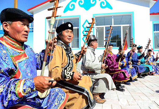 赤峰市巴林右旗巴彦塔拉苏木古力台嘎查文化广场村民用“好来宝”的曲艺形式传唱“十个全覆盖”给农牧民生活带来的新变化。