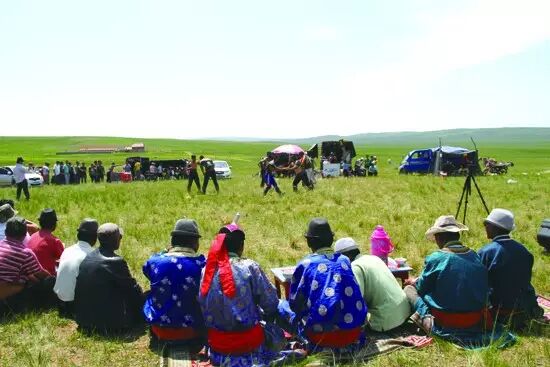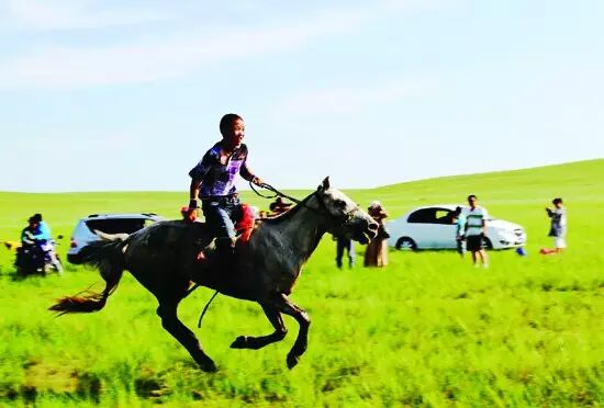 驱车行进在宽阔平坦的草原,犹如人走在地毯上,软绵绵的。刚到东乌珠穆沁旗宝拉格苏木,就听到前面人声鼎沸,对面远远的天边,有烟尘升起,越来越浓,越来越近。忽然数匹奔马由天边带着浓浓的尘土一点点横扫而来,几个、几十个、上百个骑士,他们挥动着鞭子,直奔终点。原来这里正在举行民间赛马,我急忙跳下车子,加入到欢呼的人群当中,漫天尘土,只听见马蹄的踏地声。隐约间,看见一匹棕红色的马领先了,后面一匹白色的马也不甘示弱,使足了劲向前冲,眼睛瞪得大大的,注视远方。骑手一扬鞭子,白色马儿仰天长鸣,快速向前冲去。