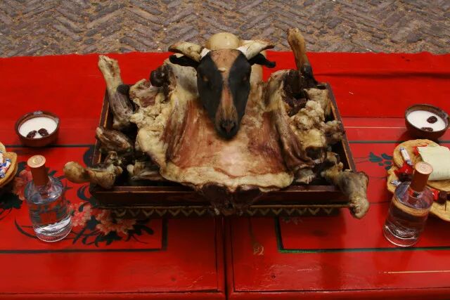 羊背子是传统的名贵菜肴,一般在祭祀、婚嫁、老人过寿或欢迎亲朋贵宾的宴席上才能见到。做法是:把全羊卸成七大件(除去胸叉),带尾入锅,加盐煮熟。用大盘先摆四肢、羊背颈胛,羊头放在羊背上,似羊的趴卧姿势。吃时,每人先用蒙古刀从羊尾巴上割取一条吃后就可以各取所需。羊背的烹饪摆设不仅讲究,而且吃法还有一套特殊的民族礼节。