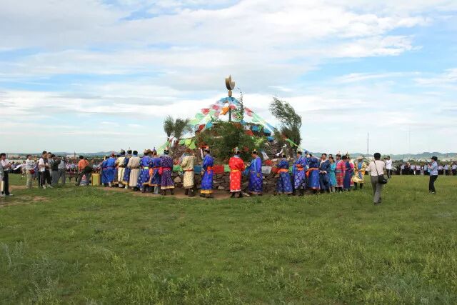 敖包是蒙古语,意为堆子或鼓包,蒙古民族盛大的祭祀活动之一。敖包通常设在高山或丘陵上,用石头堆成一座圆锥形的实心塔,顶端插着一根长杆,杆头上系着牲畜毛角和经文布条,四面放着烧香的垫石,祭祀时在敖包旁还供有整羊、马奶酒、黄油和奶酪等等,由喇嘛焚香点火,颂词念经,牧民们都围绕着敖包,从左向右转三遭,求神降福。