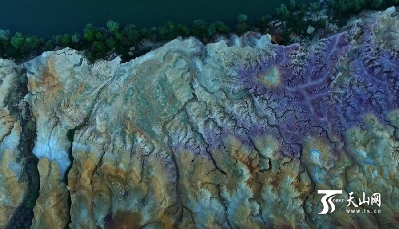 俯瞰五彩滩,色彩斑斓的雅丹地貌随着光线变换着颜色。