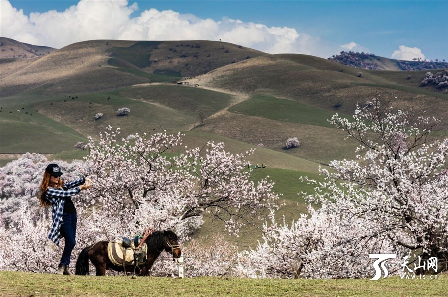 3月30日拍摄的新源县吐尔根乡野生杏花在山野间绽放,大批游客前去观光游览。