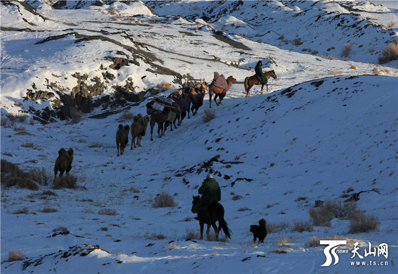 2016年11月19日,新疆阿勒泰地区的哈萨克族牧民在转场途中。 近日,阿勒泰地区的哈萨克族牧民开始今年牲畜大转场,百万头牲畜陆续转入冬牧场。