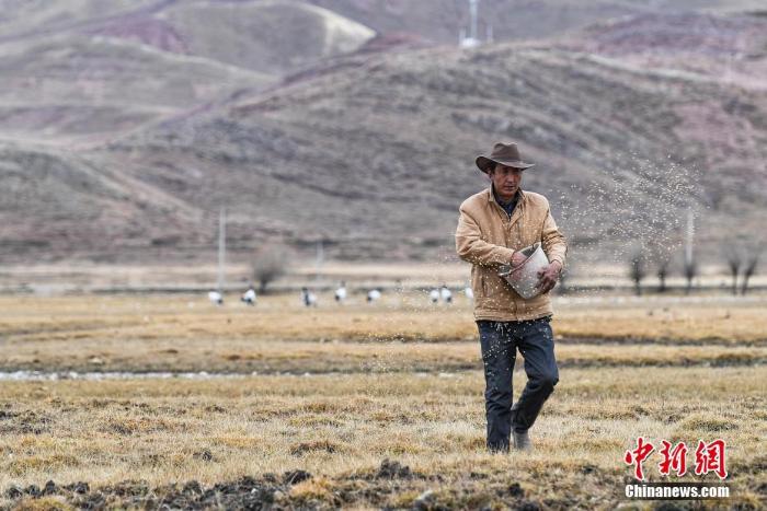 西藏林周县野保员顿珠次仁为越冬黑颈鹤喂食