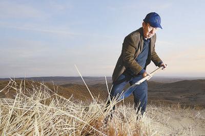 图为王有德在毛乌素沙漠边缘扎草方格(摄影:王鹏)