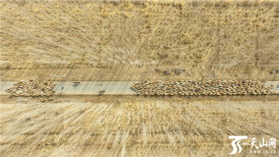 近日,新疆博乐市牧民和“访惠聚”驻村工作队队员赶着羊群正在转场
