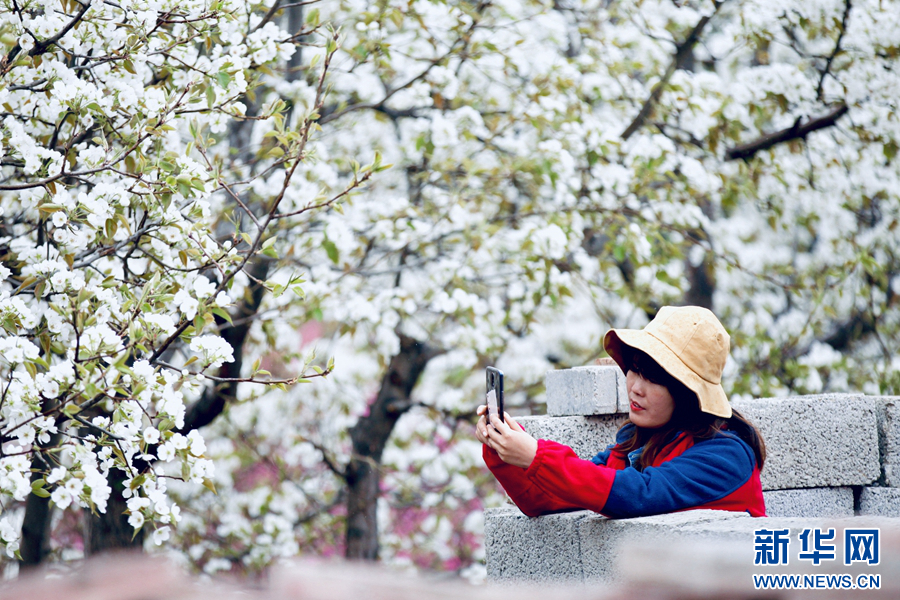 梨花飘香惹人醉,一名游客在梨花下拍照留念(摄影:杨寿德)