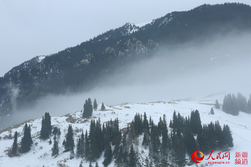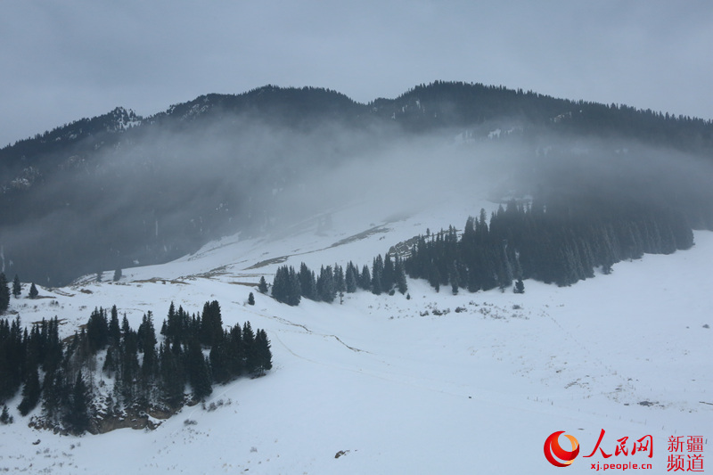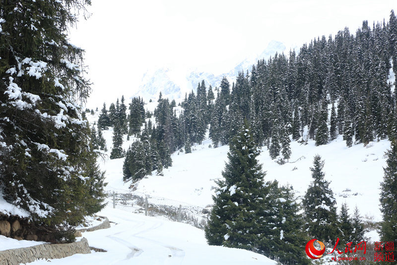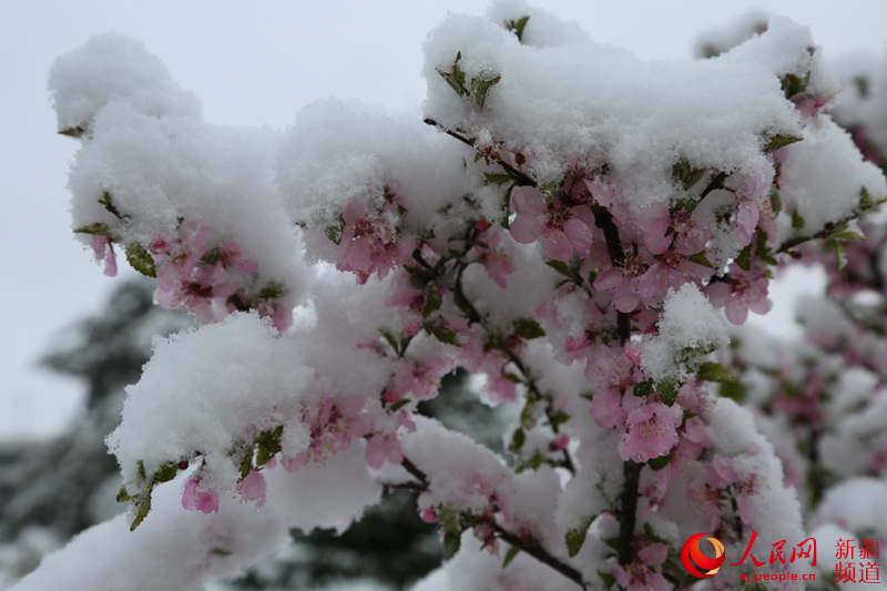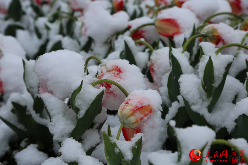 近日受天气影响,新疆昭苏高原连续降雪,树木披上了厚厚的积雪,昭苏草原银装素裹,盛开的郁金香被雪点缀,雪中盛开的桃花也分外妖娆