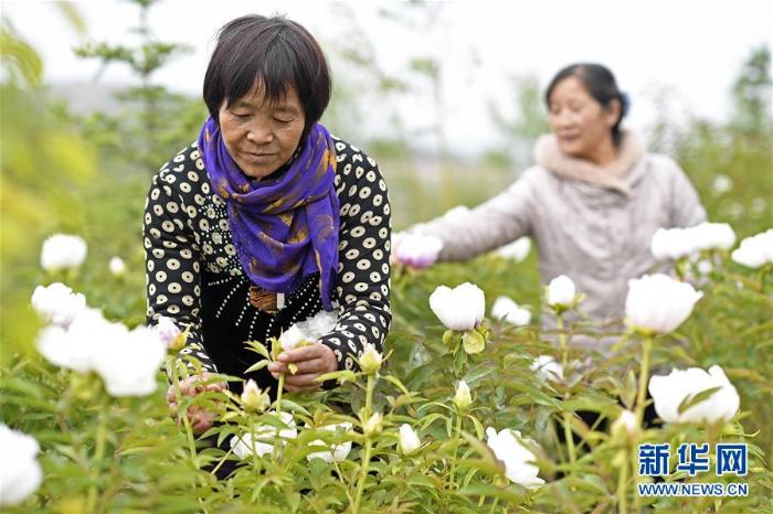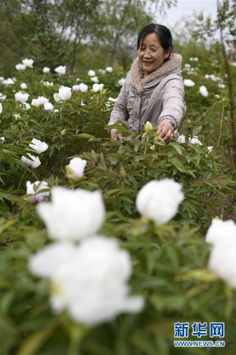 农户在西吉县吉强镇龙王坝村打理牡丹花(5月29日摄,摄影:王鹏)