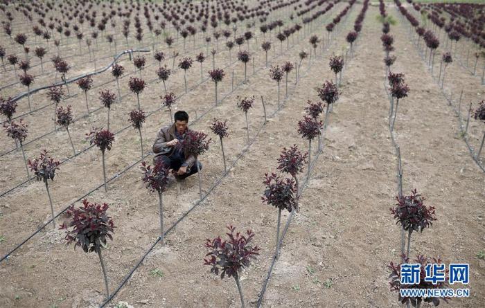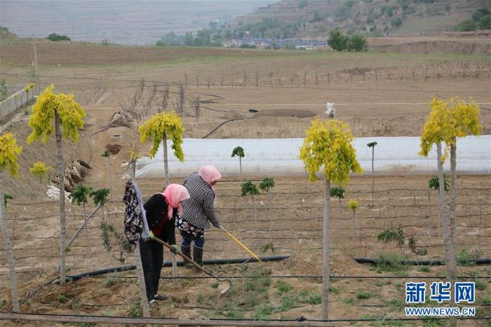 农户在西吉县平峰镇高赵村打理苗木(5月29日摄,摄影:王鹏)