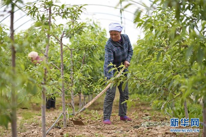 农户在西吉县平峰镇高赵村的拱棚内为桃树除草(5月29日摄,摄影:张晨岑)
