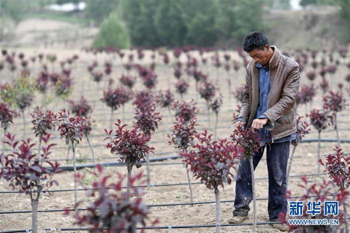 农户在西吉县平峰镇高赵村打理苗木(5月29日摄,摄影:张晨岑)