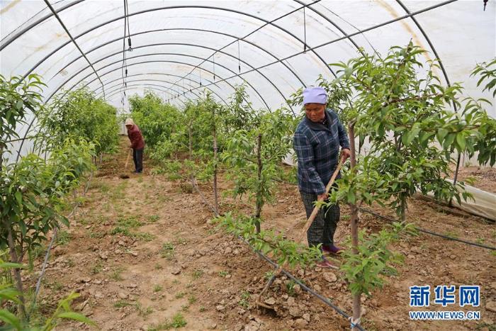 农户在西吉县平峰镇高赵村的拱棚内为桃树除草(5月29日摄,摄影:王鹏)
