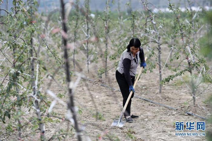 农户在西吉县兴隆镇下范村对苹果树进行田间管理(5月29日摄,摄影:王鹏)