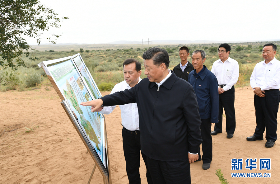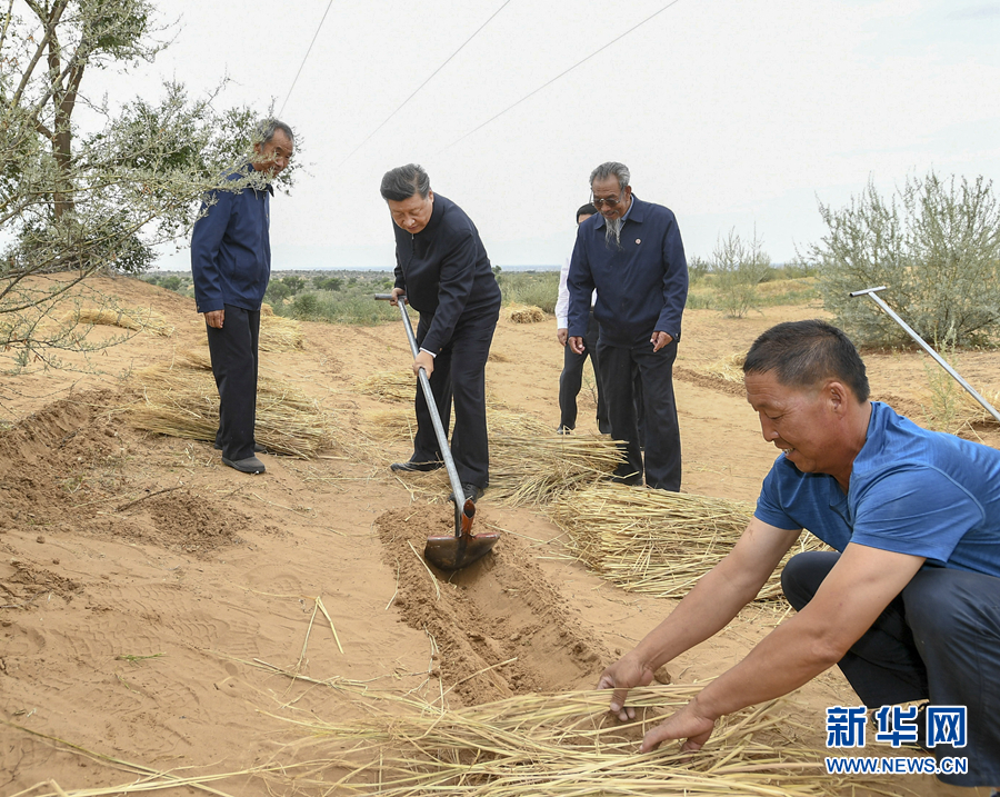 这是习近平来到武威市古浪县八步沙林场,实地察看当地治沙造林、生态保护等情况(摄影:谢环驰)