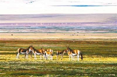 青海三江源国家公园长江源园区里的藏野驴在觅食嬉戏(摄影:韩加君)
