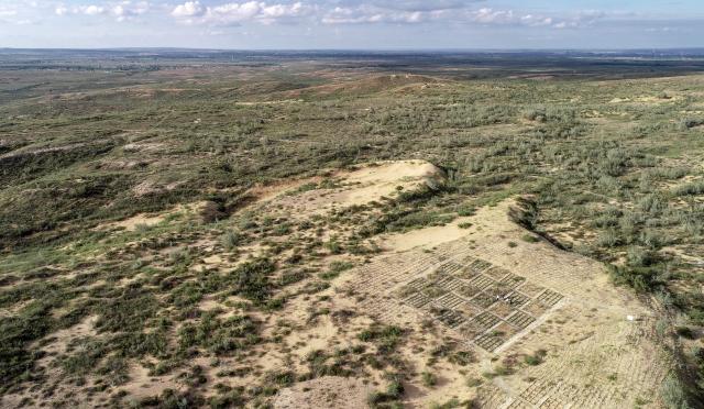宁夏盐池县沙泉湾荒漠化综合治理示范项目区内,连片的沙丘已经消失,只剩下一片留作实验观察的沙地(摄影:冯开华)