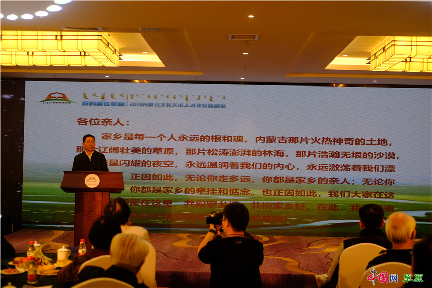 中国网10月21日讯(记者 王金梅) “家乡是每一个人永远的根和魂,内蒙古那片火热神奇的土地,那片辽阔壮美的草原……永远温润着我们的内心,荡涤着我们的灵魂。”10月20日下午,内蒙古自治区党委常委、宣传部长白玉刚在“我的根在草原——2019内蒙古文化艺术人才北京恳谈会”上的这段发言开场,让在座每一位在京草原人感到温暖和共鸣,也激发起对故乡文化艺术事业繁荣发展的参与热情。