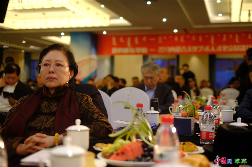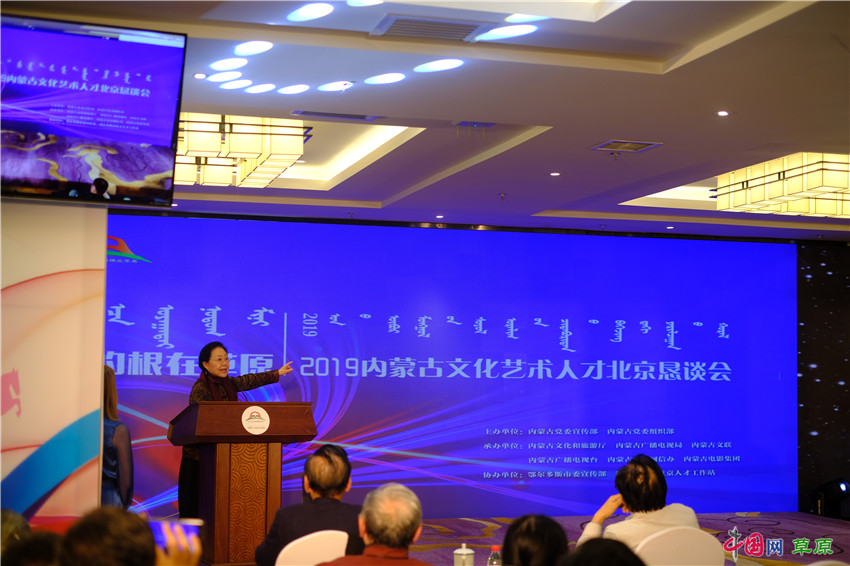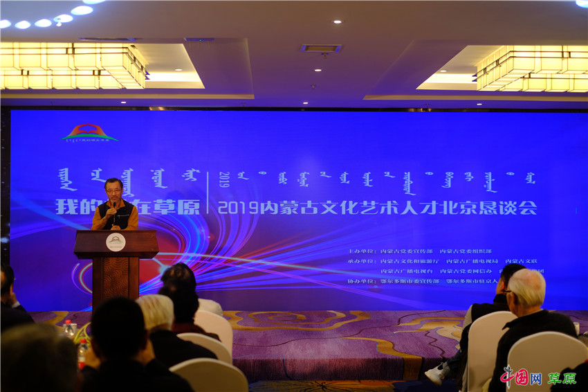 由内蒙古自治区党委宣传部、内蒙古自治区党委组织部联合主办的“我的根在草原——2019内蒙古文化艺术人才北京恳谈会”上,著名民族音乐理论家、教育家乌兰杰,世界马头琴大师齐•宝力高,著名蒙古族歌唱家拉苏荣、影视演员斯琴高娃、书法家何奇耶徒、文学评论家包明德、诗人阿古拉泰等文艺领域的内蒙古籍文艺大家和青年才俊欢聚一堂,为内蒙古文化艺术事业繁荣发展献计献策,对话交流,致力于推出更多具有草原文化风格、特色和气派的精品力作,推动内蒙古文艺创作由“高原”向“高峰”迈进,为打造祖国北疆文化繁荣的亮丽风景线贡献力量。