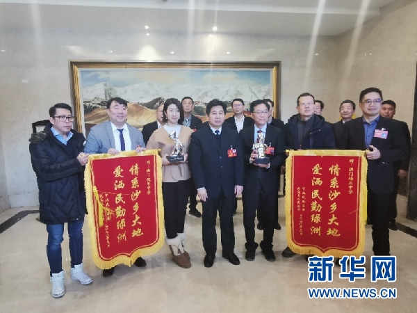 2020年1月11日,澳门中学代表向民勤县防沙治沙捐赠现场(摄影:新华社记者 何问)