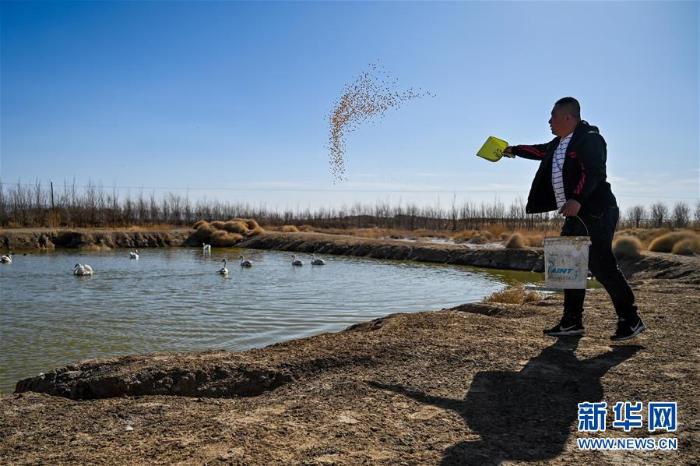 4月4日,乌梁素海湿地水禽自然保护区管理站工作人员岳建强给被救助的候鸟喂食(摄影:新华社记者 连振)
