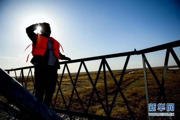 4月4日,乌梁素海湿地水禽自然保护区管理站工作人员岳建强在观测塔上观测候鸟(摄影:新华社记者 连振)