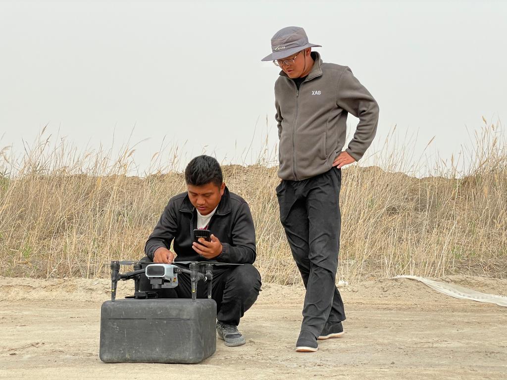 凌磊(左)和艾海鹏正在操作遥感无人机