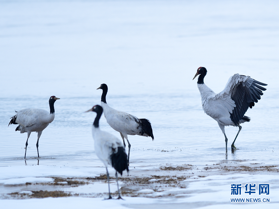 在位于青海省果洛藏族自治州玛多县的三江源国家公园黄河源园区内,数只黑颈鹤在此栖息觅食(摄影:新华社记者 张龙)