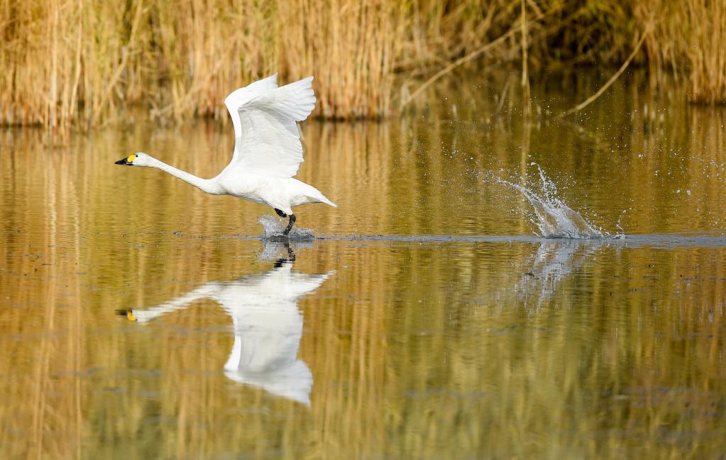 天鹅在乌梁素海水面上嬉戏(2020年10月28日摄,摄影:新华社记者 连振)