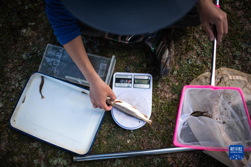 长江科学院科考队员刘晗在长江南源当曲对采集的一尾小头裸裂尻鱼称重(2022年7月25日摄,摄影:新华社记者 肖艺九)