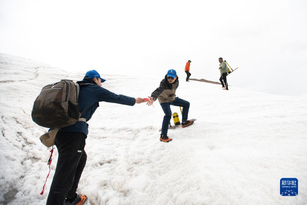 在长江源各拉丹冬雪山,来自长江科学院的科考队员范越(左二)在搬运探测设备(2022年7月28日摄,摄影:新华社记者 肖艺九)