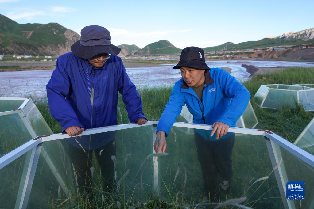长江科学院博士任斐鹏(右)和孙宝洋在江源布设六边形温箱开展“模拟增温试验”(2021年7月22日摄,摄影:新华社记者 张龙)