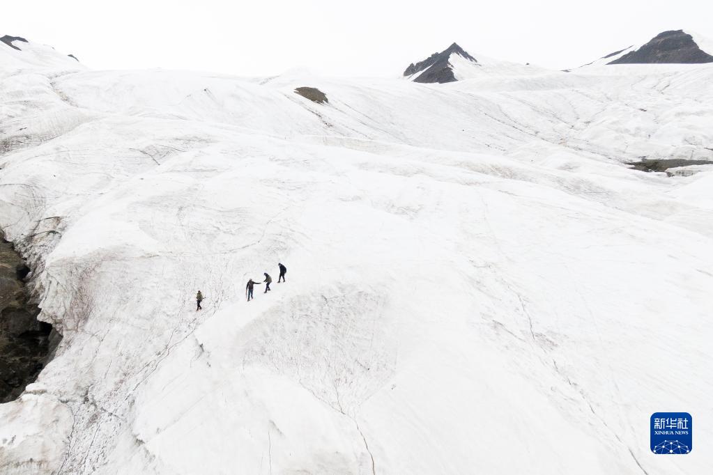 来自长江科学院的科考队员在各拉丹冬雪山上(2022年7月28日摄,无人机照片,摄影:新华社记者 肖艺九)