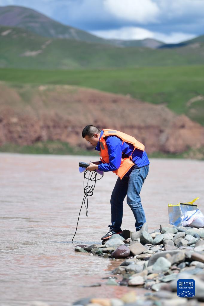 长江科学院流域水环境研究所副所长赵良元在长江上游通天河流域观测水文(2021年7月24日摄,摄影: 新华社记者 张龙)
