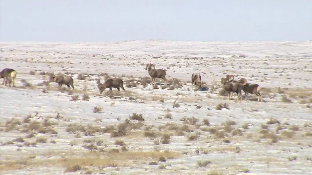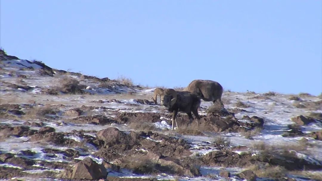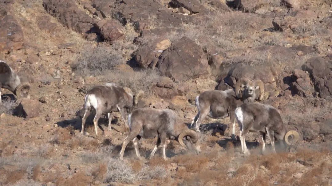 11月15日,内蒙古锡林郭勒盟苏尼特右旗额仁淖尔苏木境内,几十只野生盘羊觅食、奔跑、跳跃,记者用摄像机记录下这些“草原上的精灵”。