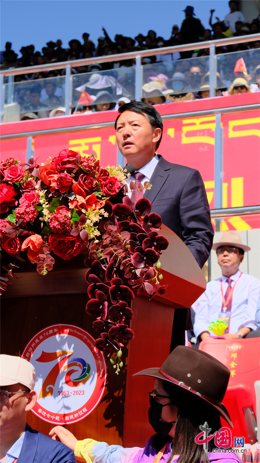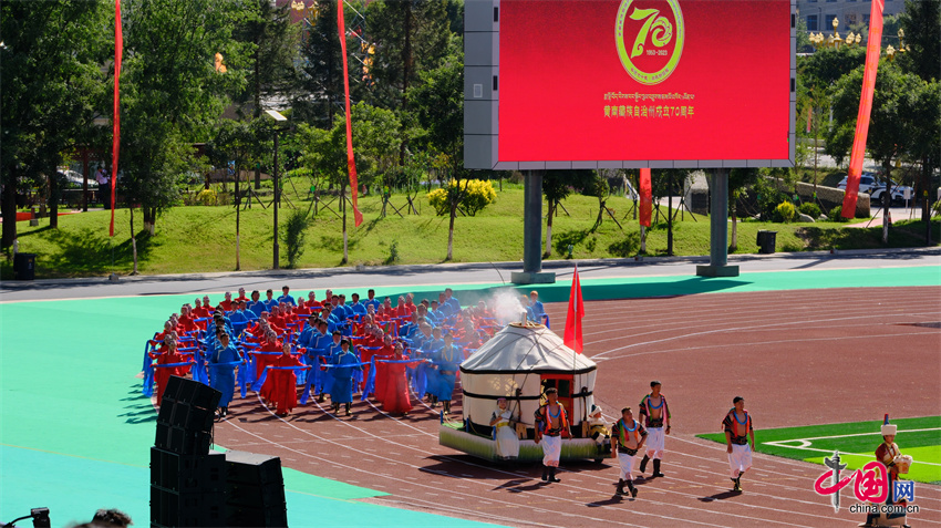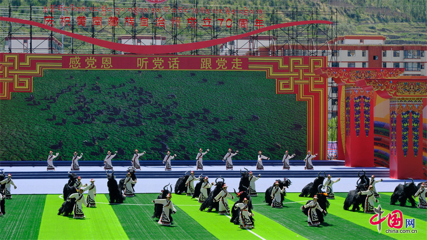 中国网7月30日讯(记者王金梅)大美青海·山水黄南!盛夏的“历史文化名城、热贡艺术故乡、梦想成真的金色谷地”——青海省黄南藏族自治州天青水碧、鸟鸣花香、热闹欢腾、歌舞飞扬,30日上午,黄南藏族自治州成立70周年庆祝大会隆重开幕!28万黄南儿女以崭新的节日盛装、一场文艺盛宴向党和祖国感恩、汇报,向八方宾朋致谢、欢迎。