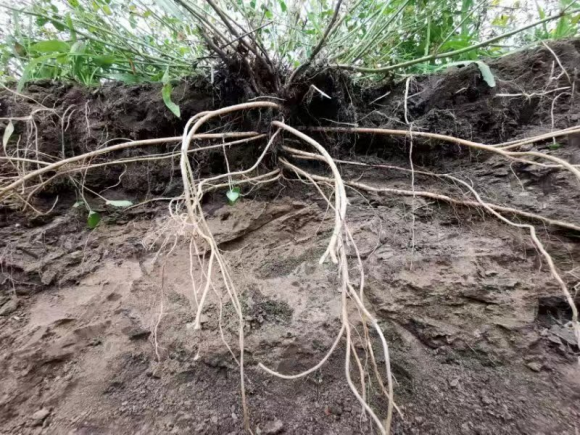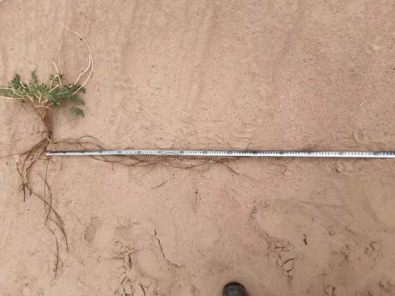 斜茎黄芪在栗钙土根深达1.5米左右,在沙地上横走根长2.5米以上