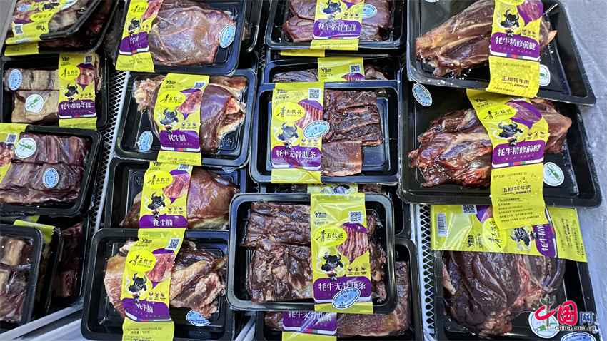 体验店揭幕首日,高搭的彩门和藏式风格的门面都吸引着人们入内一探究竟。走进店里,经过精细化切分的牦牛腩、带骨牛排、无骨肋条、精修前腱等经过精细化分割的牦牛肉品整齐地摆放在冰柜中,牦牛酸奶、奶酥皮、牦牛奶干、果粒乳酪等奶制品琳琅满目,枸杞原浆、冻干枸杞、藏红花等保健品也让不少人驻足观看。顾客们有的翻看着产品配料表,有的向店员咨询产品细节,有的品尝着试吃品,直观品味“舌尖上的玉树”。