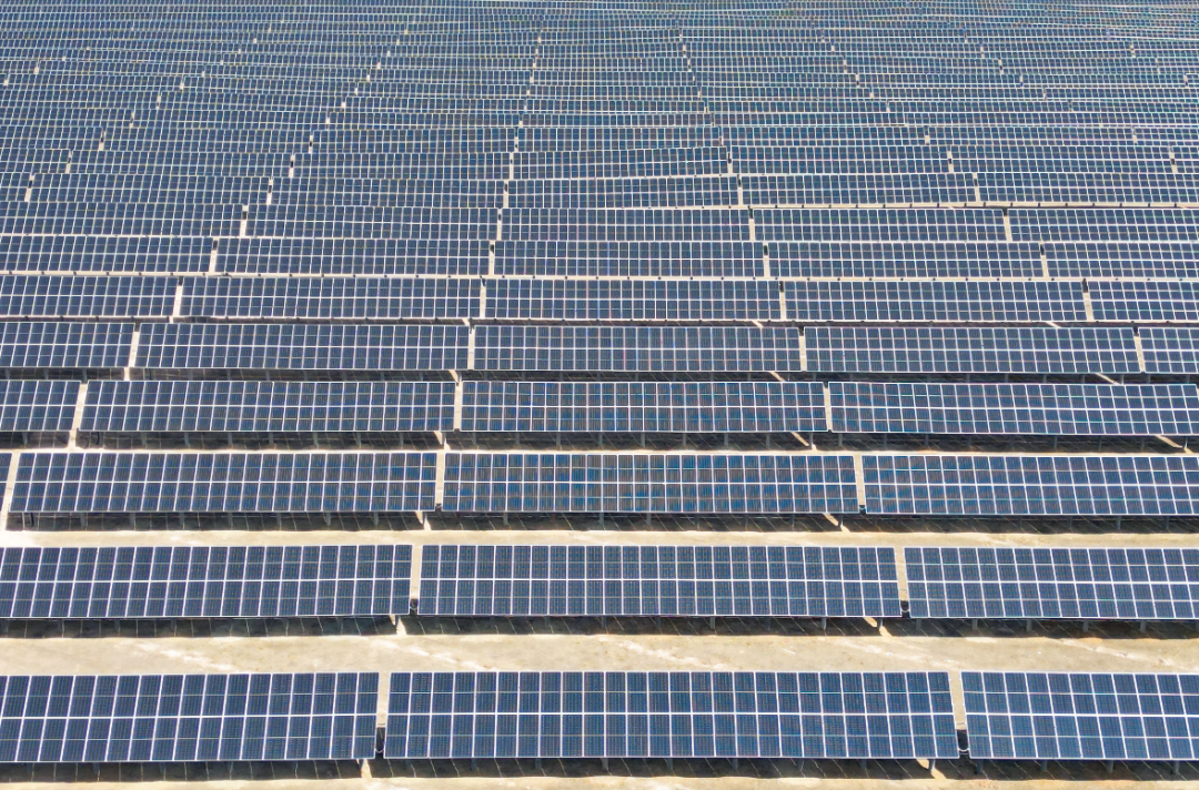 中广核兴安盟防沙治沙和风电光伏一体化项目,一片片光伏板在阳光照耀下熠熠生辉
