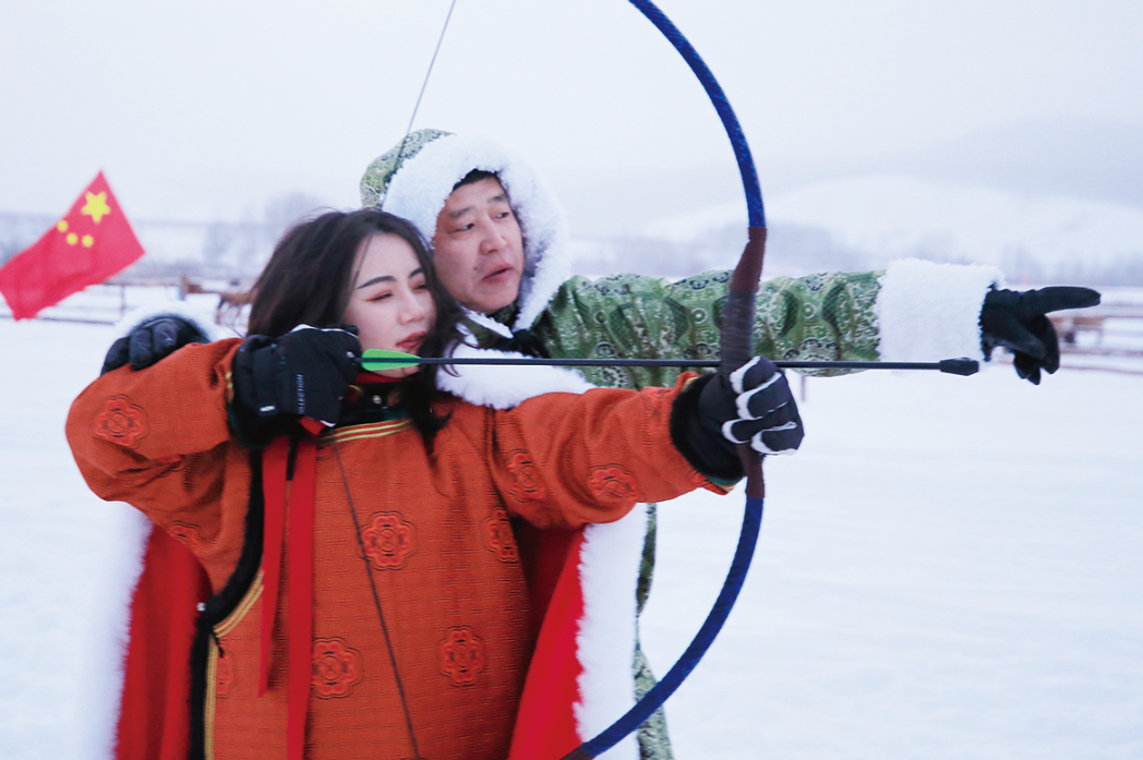 游客在阿尔山学习射箭