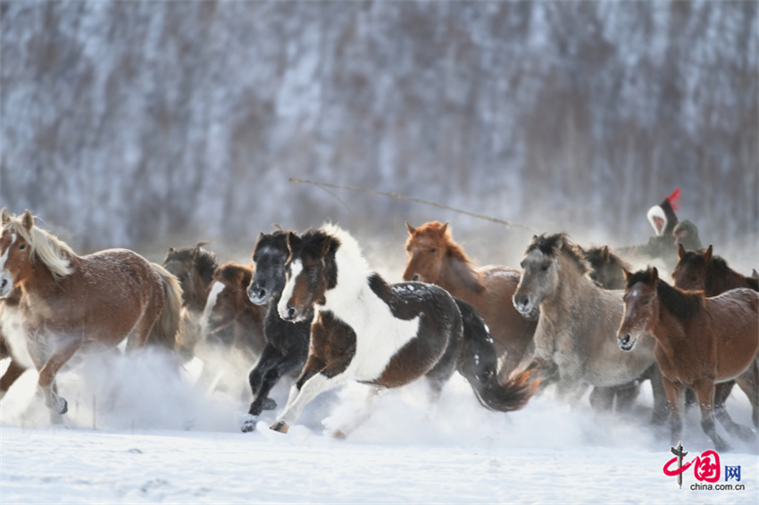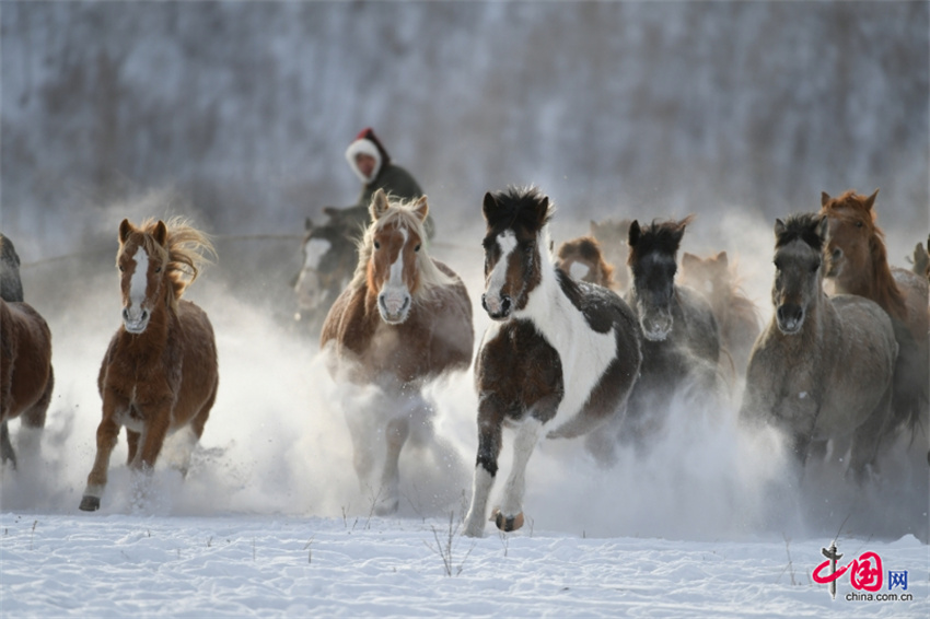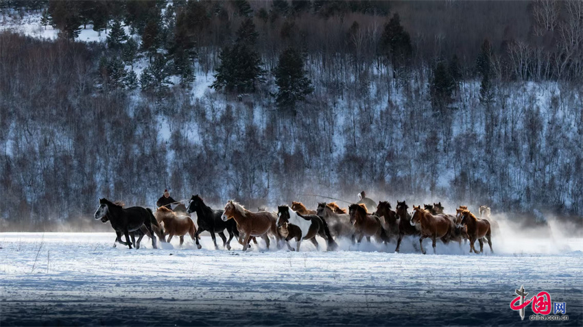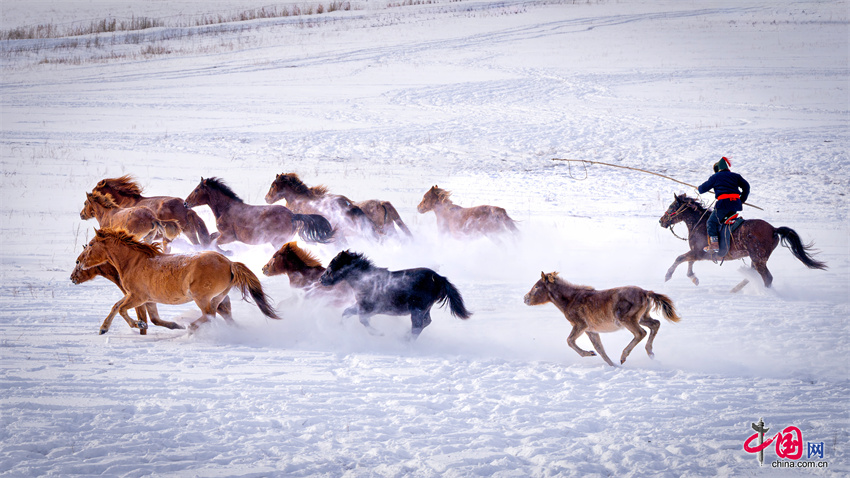 辽阔的雪原上,牧民们身着传统服饰、脚踩马靴,手持长长的套马杆策马奔腾。马群扬蹄间雪沫飞溅,牧民眼神锐利、动作精准利落,手中的套索稳稳飞向目标马匹,每一个动作都尽显技艺精湛,引来现场游客的阵阵欢呼与喝彩。