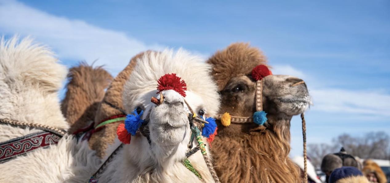 博克手们在冰天雪地中展开力量与智慧的较量。冬季骆驼毛丰体健,由牧人盛装打扮的骆驼披彩列队,宛如雪地巡游的雄狮,彰显“沙漠之舟”的庄严与华美。