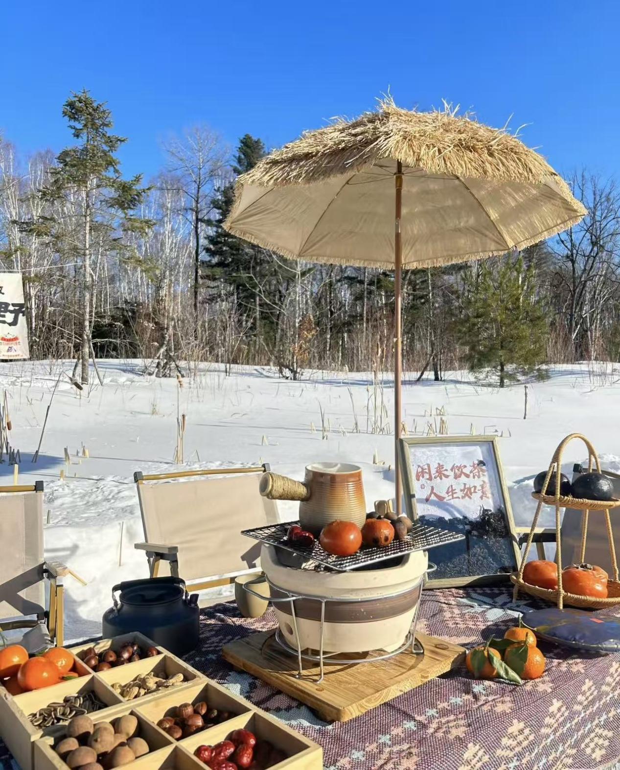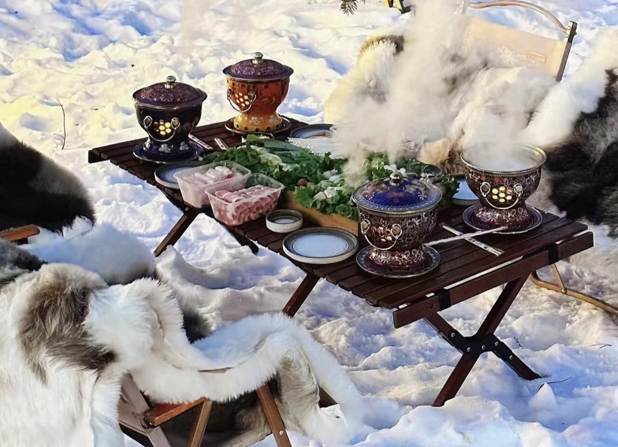 浑善达克沙地牛肉火锅无疑是这里的主角。生长于沙地的牛群,食纯天然野草,饮清冽的河水,成就了肉质独特的香气与口感。冬日正是脂肪与肌肉均匀交融的黄金时节,一口鲜嫩,回味悠长。天南地北的食客围坐于长条火锅桌旁,共话冰雪,共品热腾。此外,“围炉煮茶”将草原奶茶与现代茶香巧妙融合,冰雪烧烤则带来冰火交织的味觉碰撞。