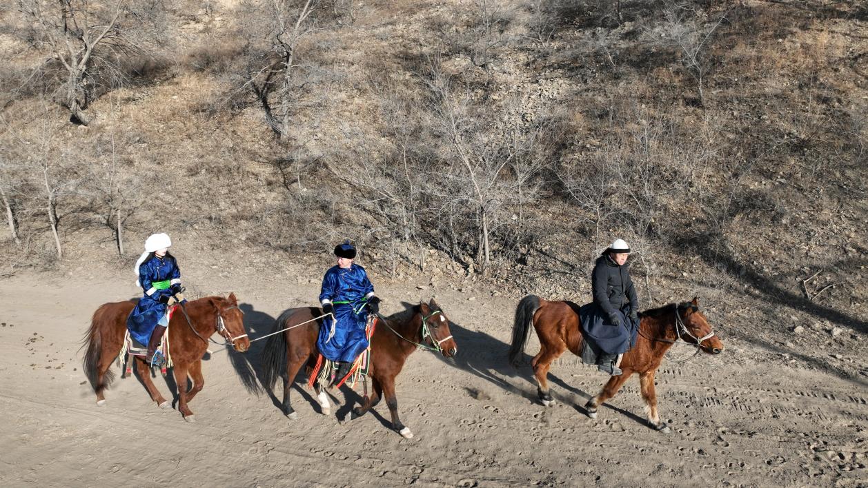 在葛根庙镇哈日野马吐嘎查的野骑场地,一匹匹骏马昂首奋蹄、精神抖擞。骑手们身着色彩艳丽的蒙古袍,身姿挺拔地端坐马背,随着马匹的稳健步伐缓缓前行,与冬日雪景构成一幅灵动的民俗画卷。凛冽寒风中,大家的脸上都洋溢着轻松愉悦的笑容,尽情享受与自然相拥的惬意时光。