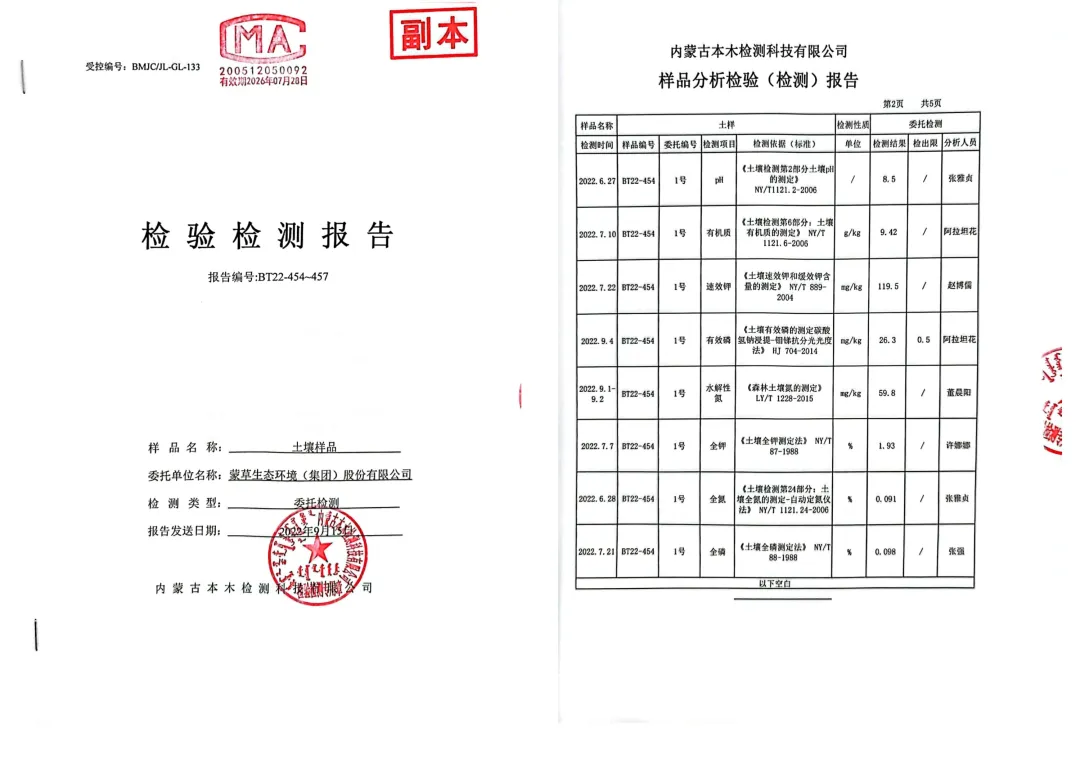 依托CMA资质认定检化验中心对采集来的生态样本进行复核,出具草种、土壤、肥料、水质等生态检测报告,为制定治沙选种用种、技术实施方案提供科学依据。