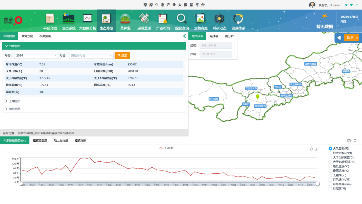 利用生态大数据平台查询杭锦旗境内的库布其沙漠“水土气植动微”等生态关键因素指标数据,节约时间、人力成本,精准快速分析修复地各项生态数据指标。