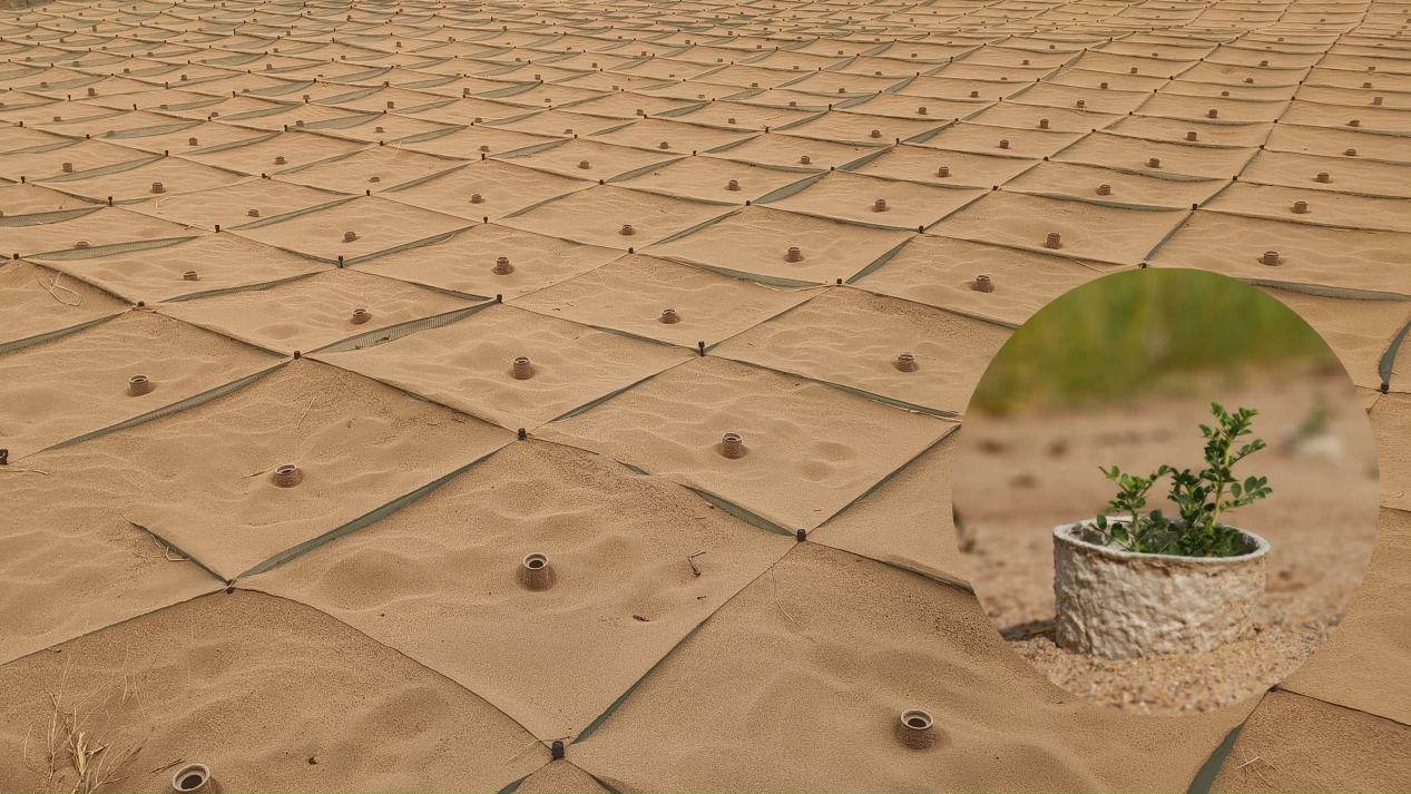 网格直立沙障搭配种子杯治沙,相比传统人工种植成活率提高30%,后期养护节省成本20%~30%